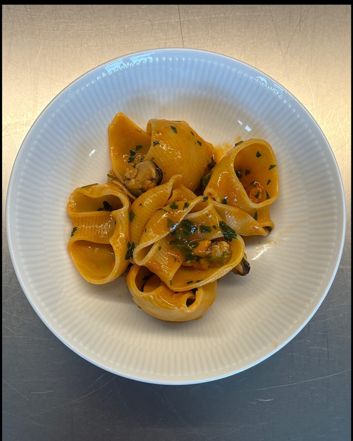 Large pasta in a spicy sauce with mussels and fresh parsley.