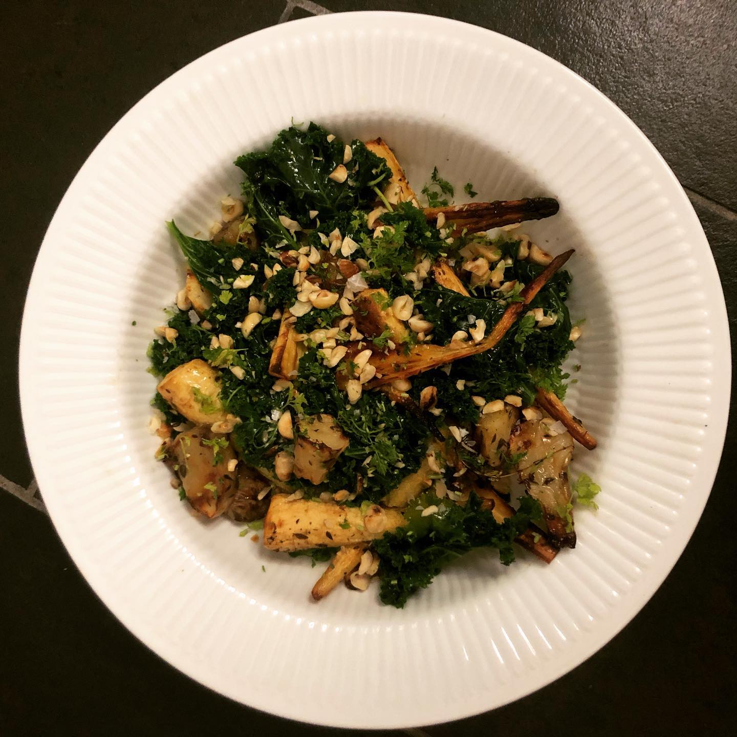 Root Vegetable Winter Salad, with kale, hazelnuts and lemon curd dressing
