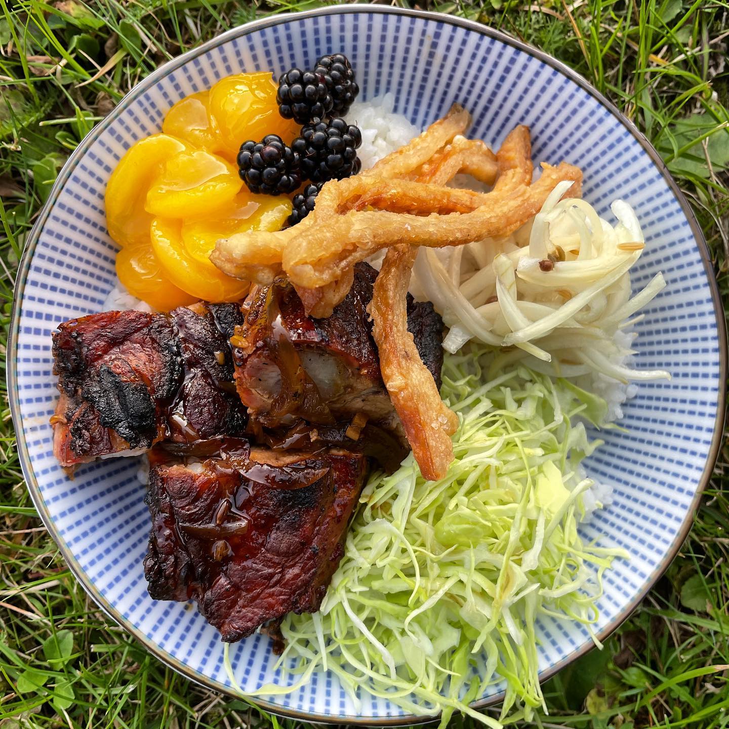 Summer Pork Poke Bowl, with plum’s and Blackberries from the garden