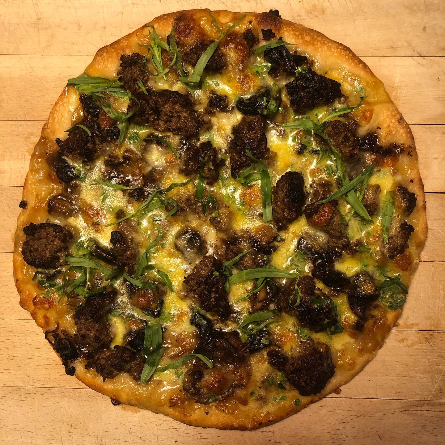Is this pizza? “Dansk bøf” with onions and bearnaise. Definitely tasty!