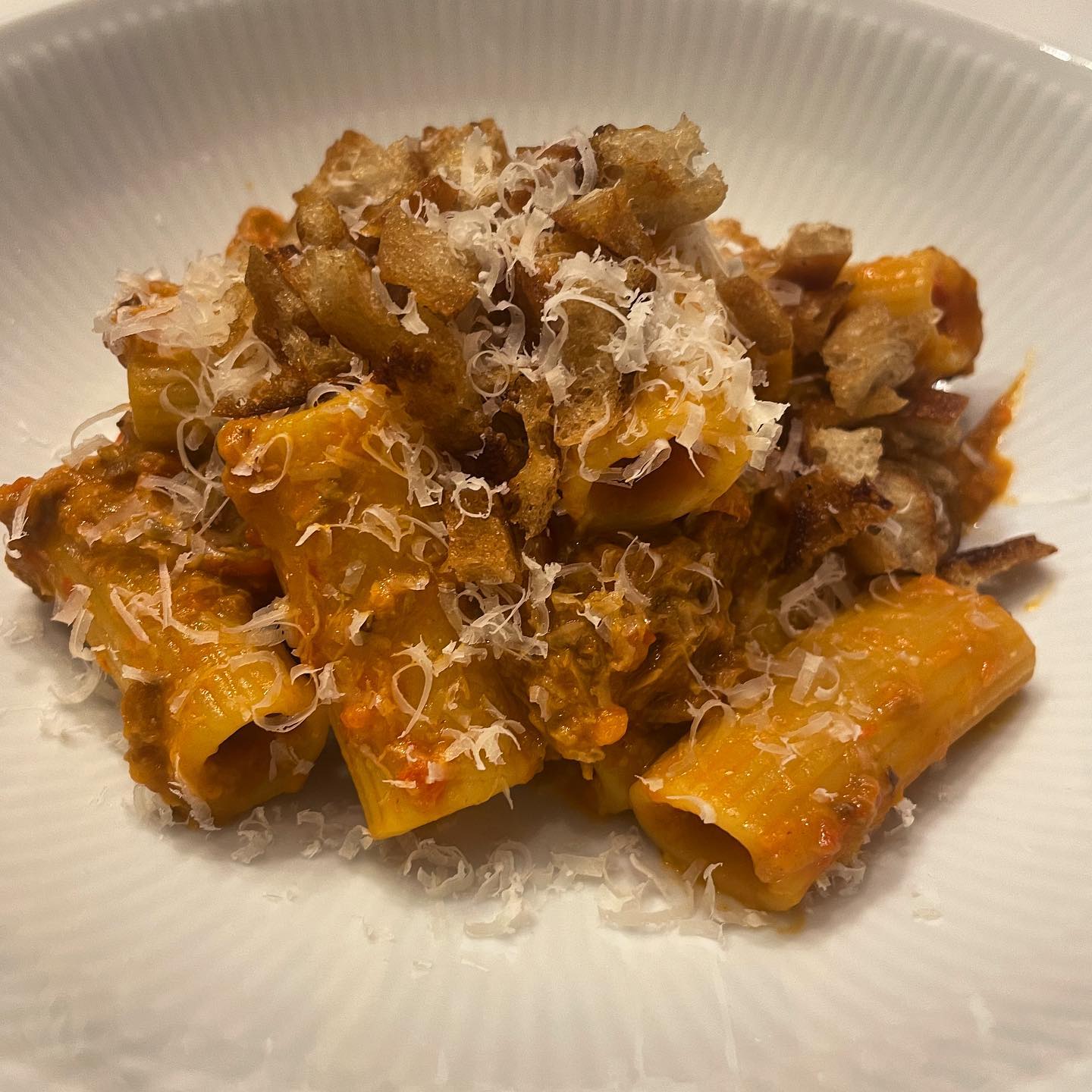 Pasta with pork, red pepper ragout and focaccia croutons
