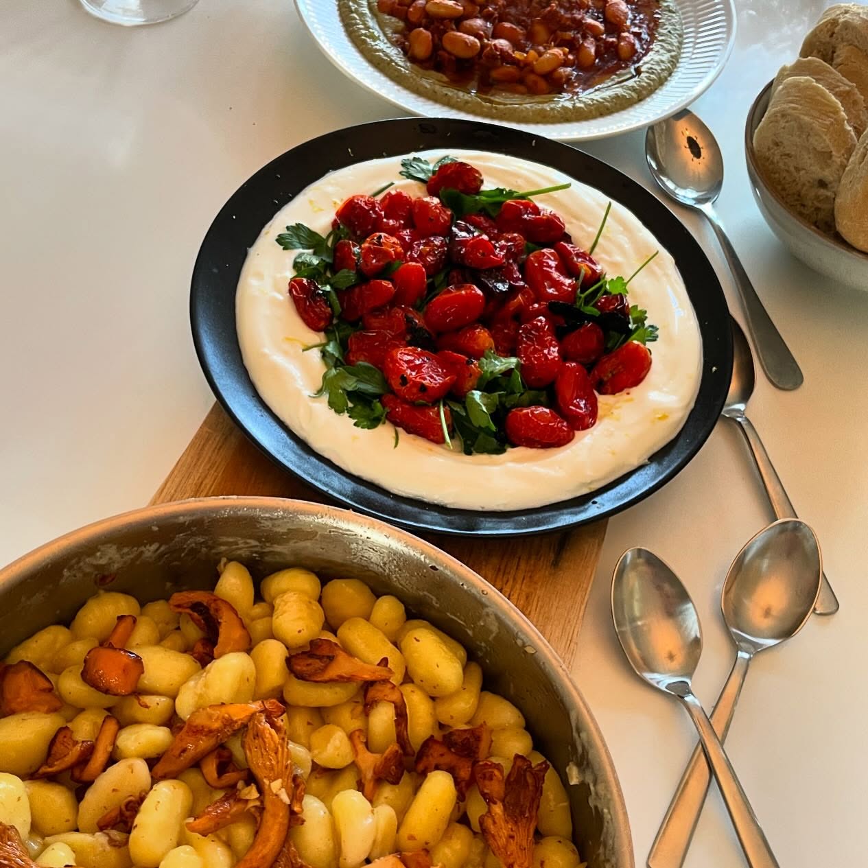 Veggie night! Chanterelle Gnocchi, roasted tomatoes on yogurt, paprika beans on baba ganoush.