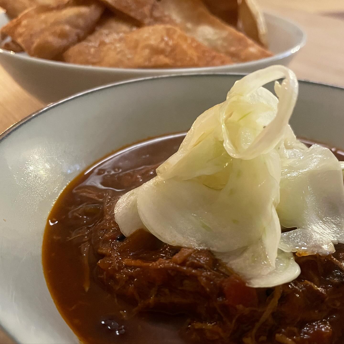 Pulled pork braise, in dark chocolate sauce. Ready to dip the homemade tortilla chips.