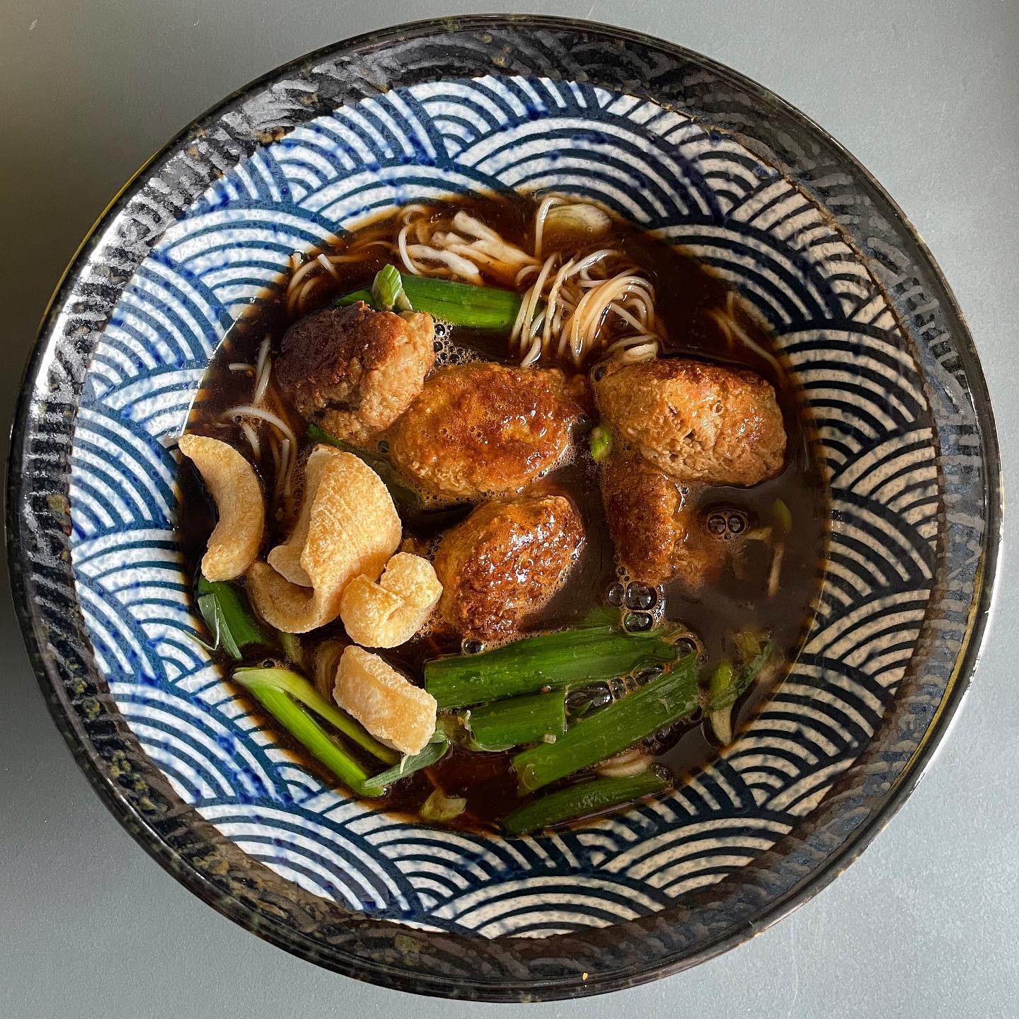 Thai Noodle Soup, meatballs and pork crackling